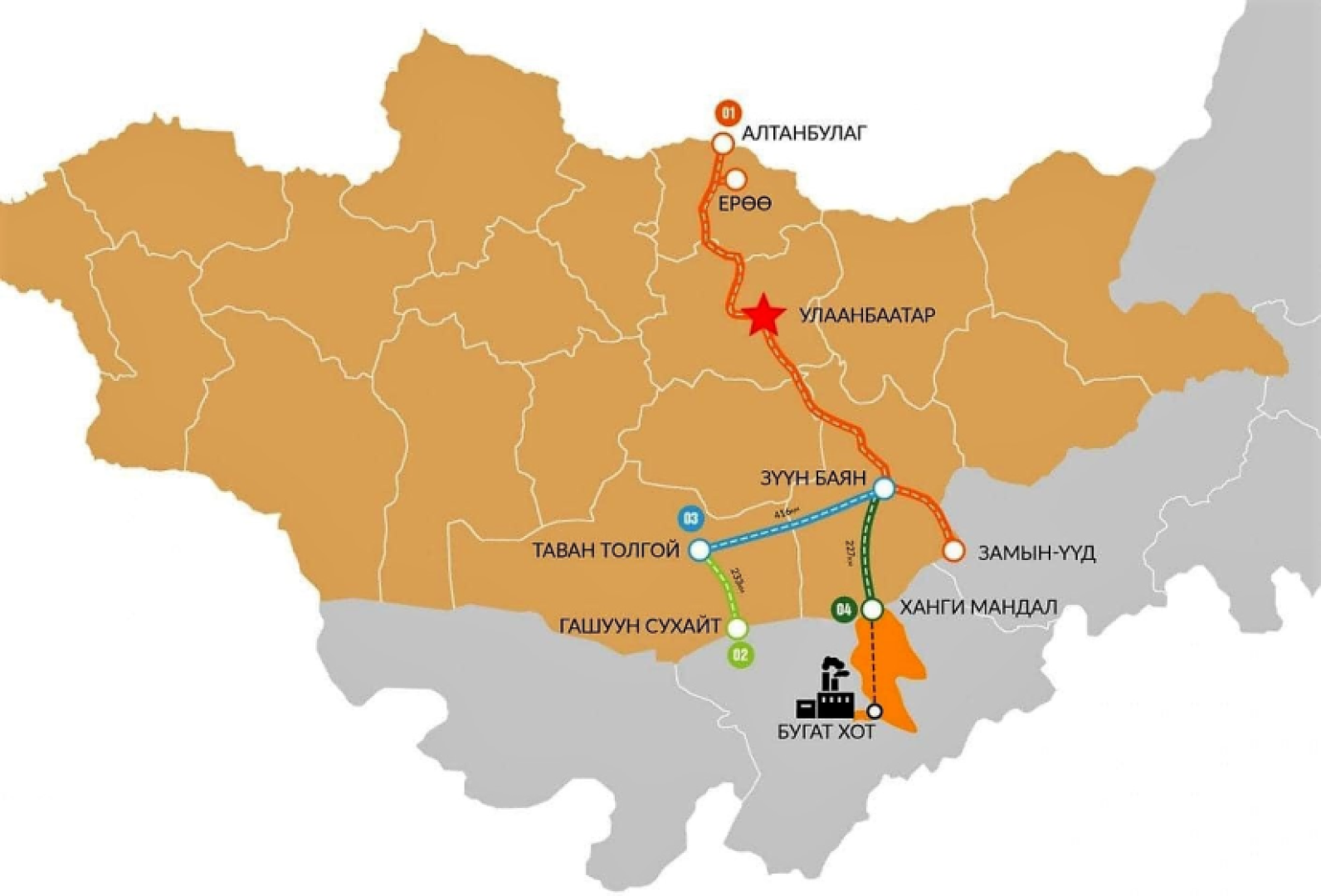 The construction of the 226 km railroad officially started on March 12. By putting the Zuunbayan-Khangi railroad and the Khangi railroad border checkpoint into operation, transportation costs for exporting coal, iron ore, and copper concentrate will reduce and competitiveness will increase. As the location of Khangi border checkpoint is close to the plants and factories near Bugat and Ordos, it also creates favorable conditions for competition through more opportunities to export mining products.